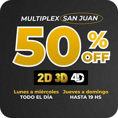 Beneficio: 2×1 en películas 2D y 3D todos los días. VALIDO UNICAMENTE ONLINE. Válido para el complejo Multiplex San Juan en Espacio San Juan Shopping. Vigencia hasta el 31/12/2025 inclusive. Válido únicamente en Multiplex San