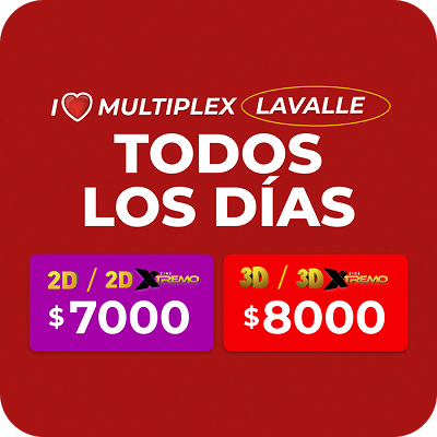Todos los días las entradas 2D, 3D y Xtremo a un precio inigualable en Multiplex Lavalle Beneficio: Multiplex Lavalle entradas 2D $ 7.000 | 2D XTREMO $ 7.000 | 3D $ 8.000 | 3D XTREMO